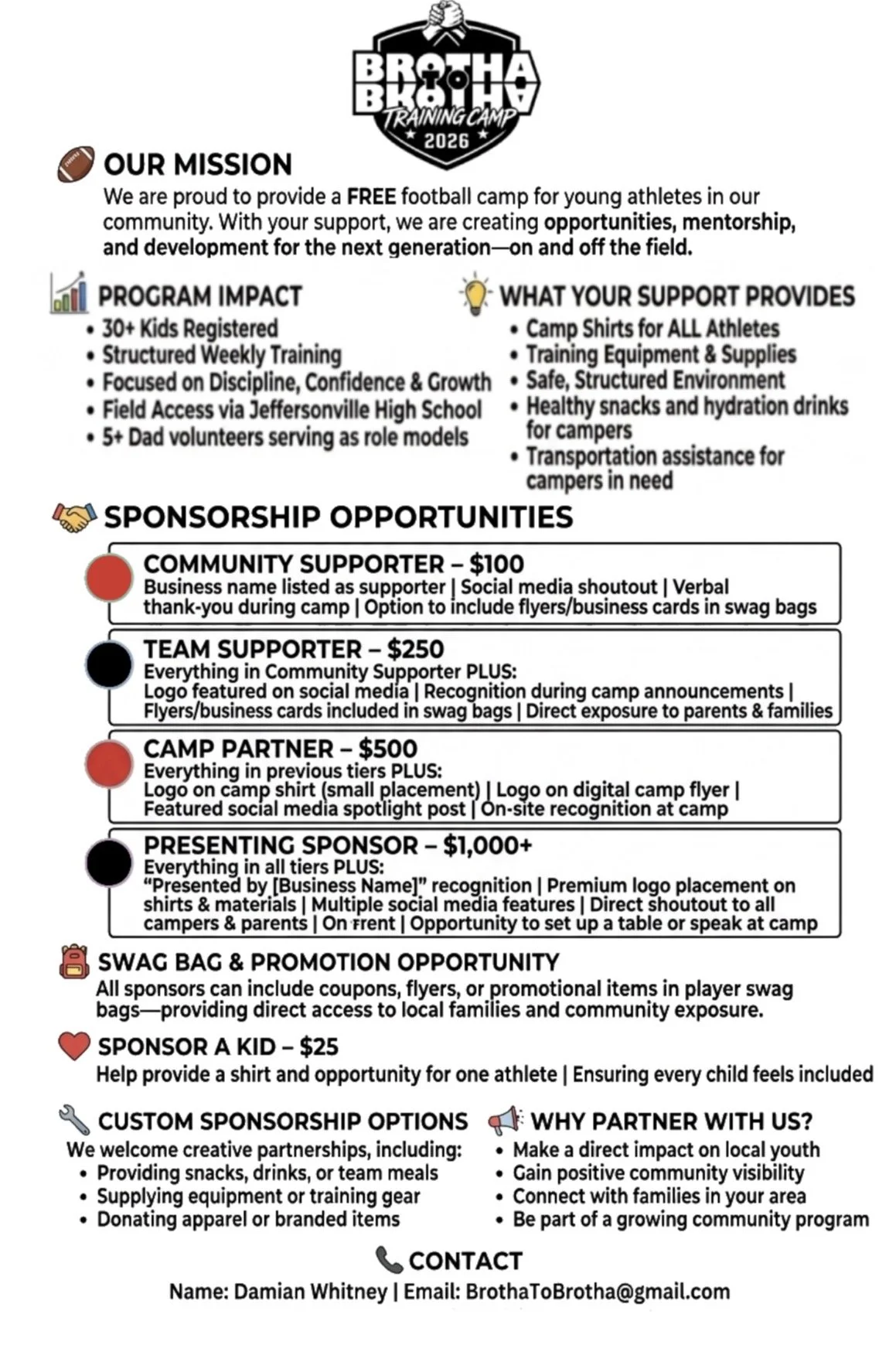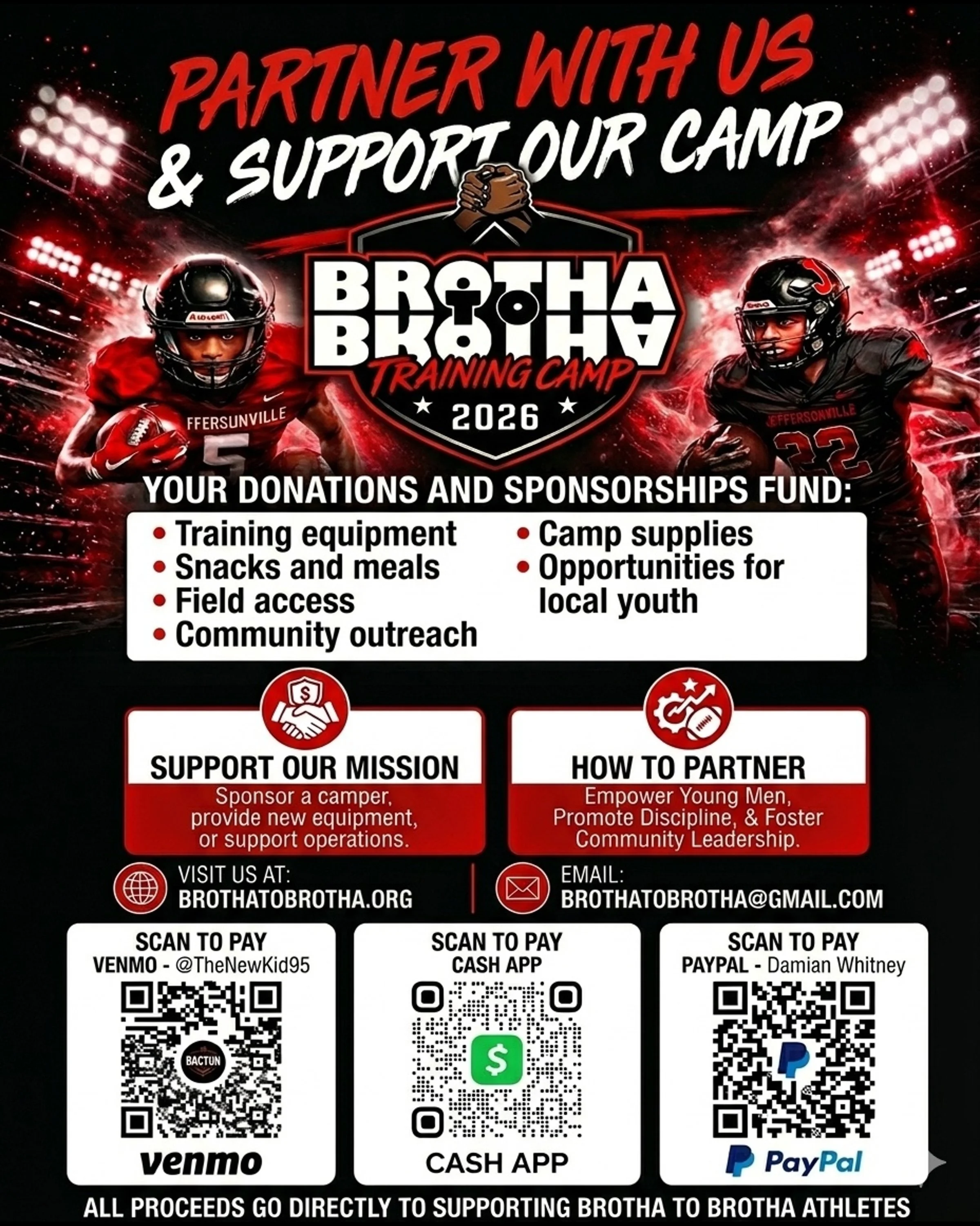 Your support funds equipment, coaching, safety measures, shirts for the campers, supplies, healthy snacks and possibly transportation, so kids can grow as players and leaders without financial barriers. Every gift builds a stronger team, a stronger neighborhood, and a brighter future.
